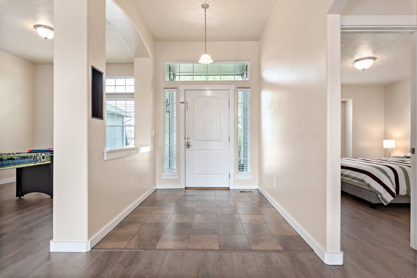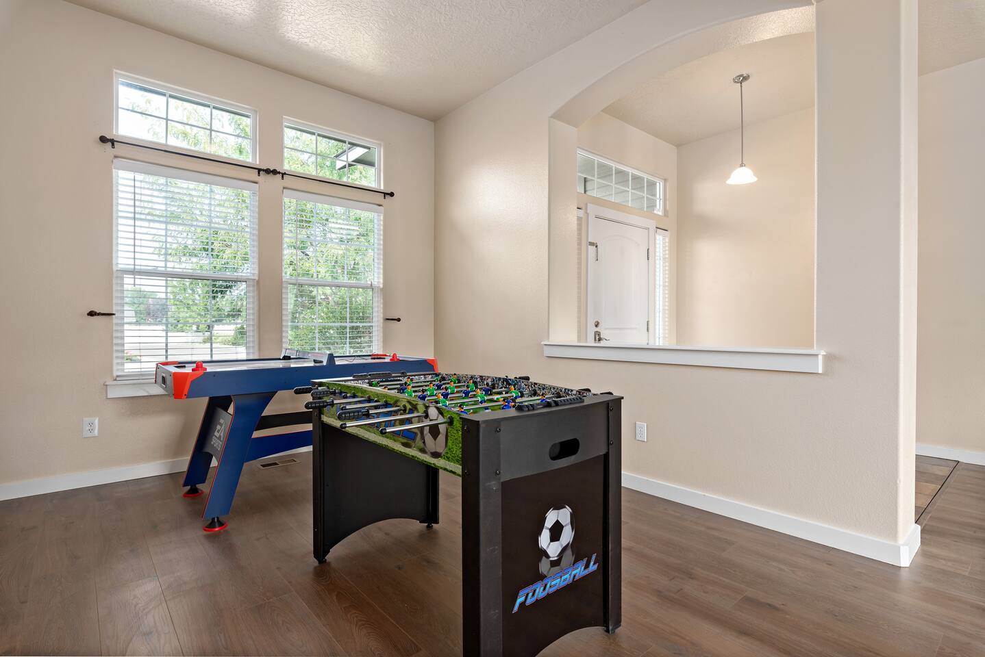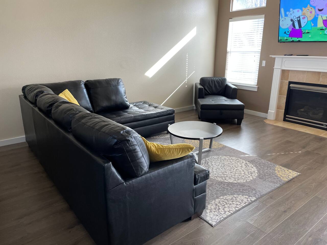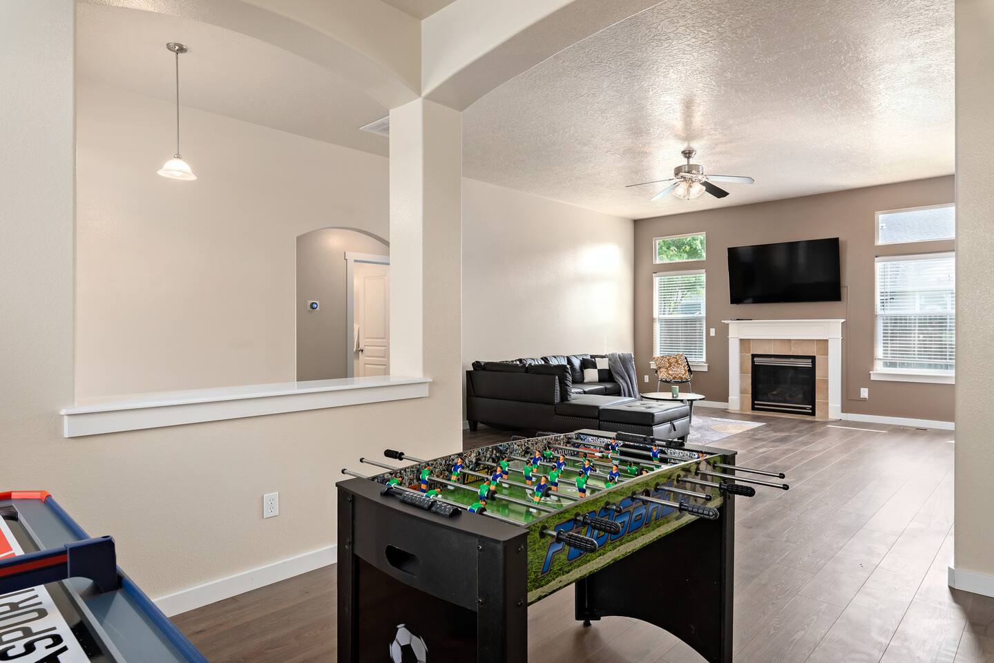 Step into a bright and inviting home designed for comfort and fun. The open-concept living space is perfect for gathering after a day of exploring. **Living Area:** * Cozy gas fireplace * Comfortable seating for the whole family * 65” Smart TV for streaming your favorite movies and shows **Kitchen & Dining:** * Fully equipped kitchen with modern appliances * Coffee maker, toaster, blender, and kettle * Dishwasher for easy cleanup * Full set of dishes, utensils, and basic cooking essentials (pots, pans) * Dining table with seating for six **Bedrooms:** * Master Suite: Plush king-sized bed, 55" Smart TV, and a dedicated desk with high-speed Wi-Fi. * Two additional comfortable bedrooms for a restful night's sleep. **Family Fun & Amenities:** * Game room with foosball and air hockey tables * Private, fully fenced backyard with a BBQ grill * Full-size clothes washer and dryer * Family essentials provided: portable crib, walker, and high chair.