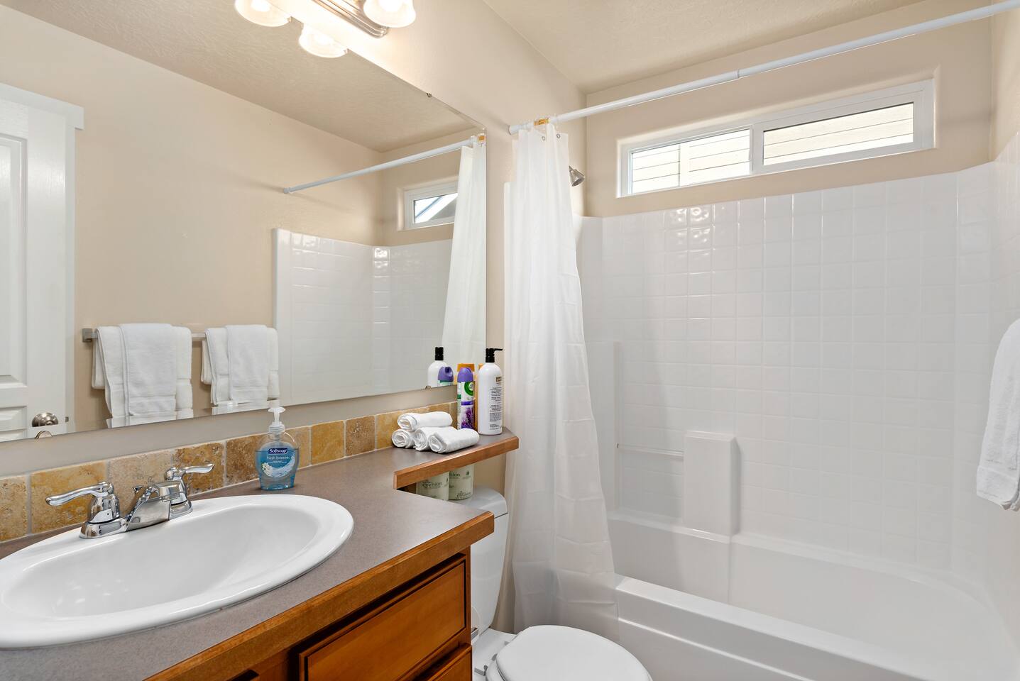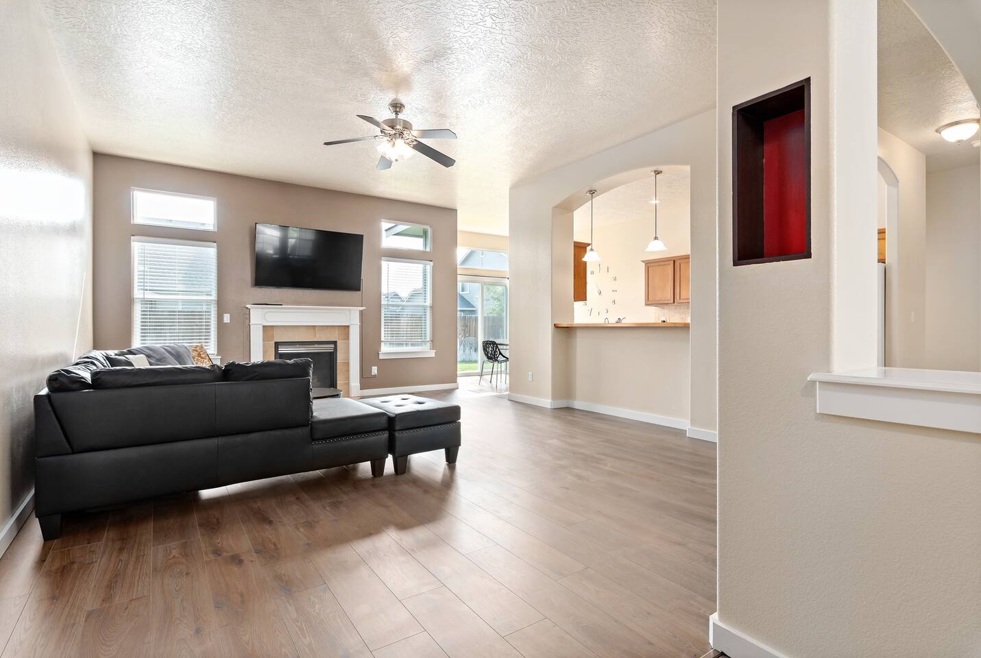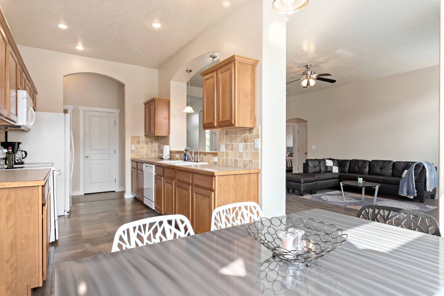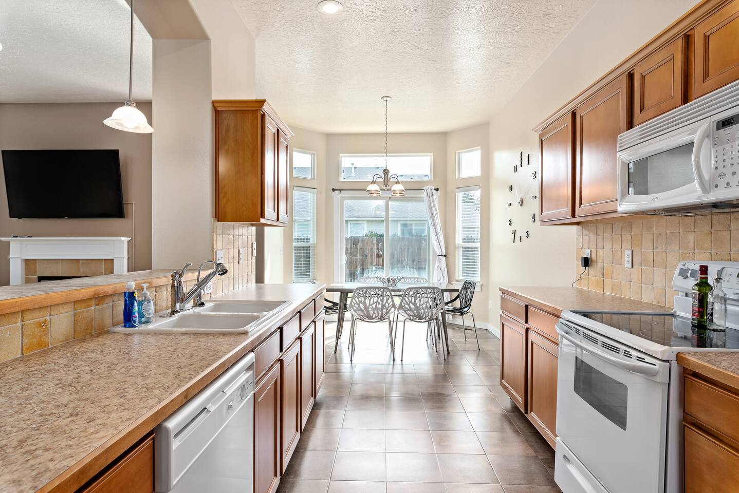 Step into a bright and inviting home designed for comfort and fun. The open-concept living space is perfect for gathering after a day of exploring. **Living Area:** * Cozy gas fireplace * Comfortable seating for the whole family * 65” Smart TV for streaming your favorite movies and shows **Kitchen & Dining:** * Fully equipped kitchen with modern appliances * Coffee maker, toaster, blender, and kettle * Dishwasher for easy cleanup * Full set of dishes, utensils, and basic cooking essentials (pots, pans) * Dining table with seating for six **Bedrooms:** * Master Suite: Plush king-sized bed, 55" Smart TV, and a dedicated desk with high-speed Wi-Fi. * Two additional comfortable bedrooms for a restful night's sleep. **Family Fun & Amenities:** * Game room with foosball and air hockey tables * Private, fully fenced backyard with a BBQ grill * Full-size clothes washer and dryer * Family essentials provided: portable crib, walker, and high chair.